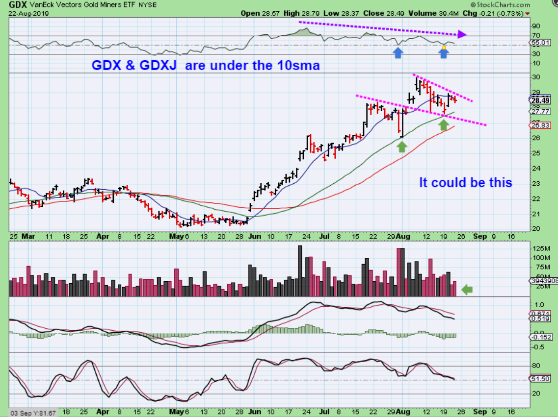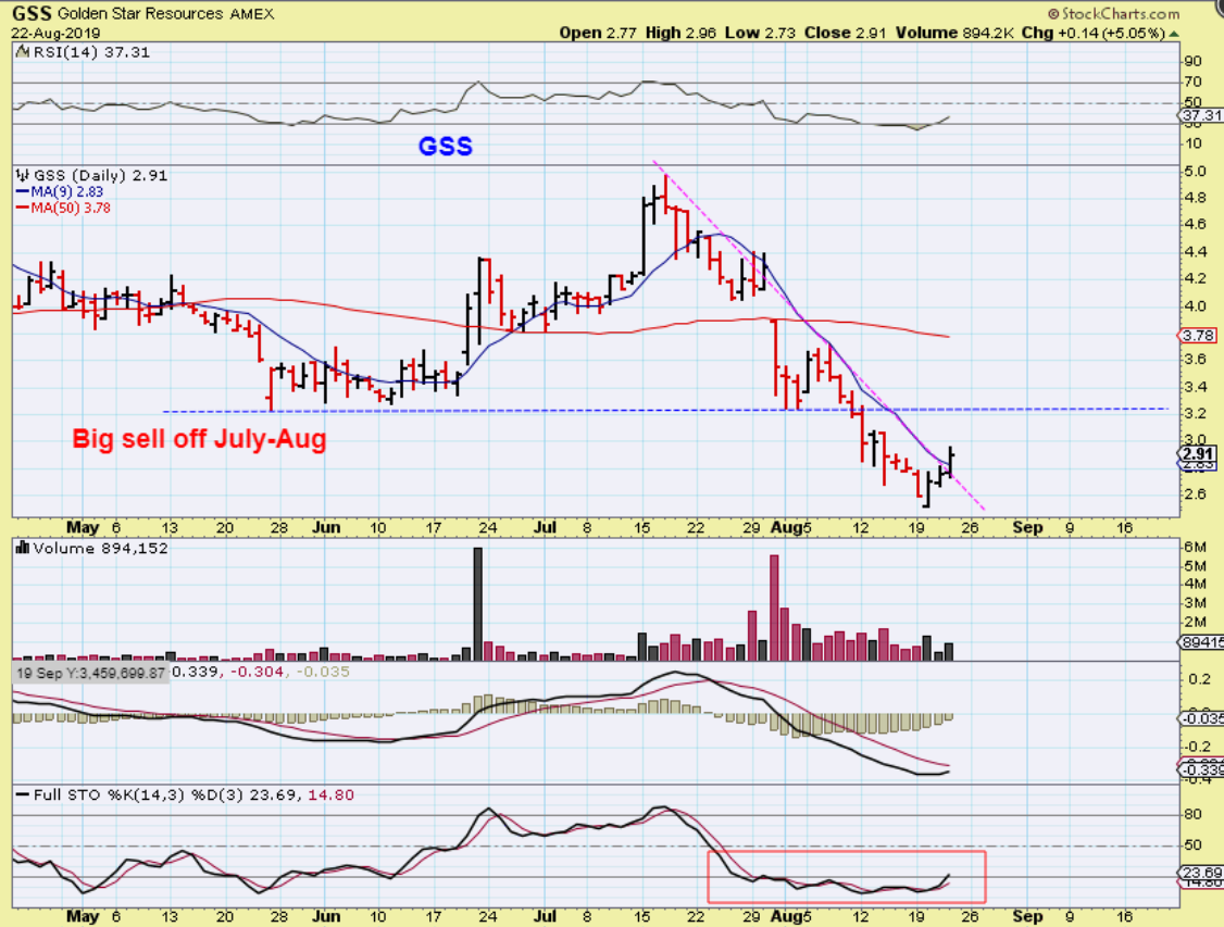 GSS – I was asked what I think of GSS pop Thursday. It is actually a bullish 3 day reversal & break of a down trend. Do I love it? Well, since it has seriously lagged and we are now getting a bit late in the intermediate Cycle, I would GUESS that it may not strongly play catch up right now. It could tag the Blue line, chop around, get above it and run to the 50sma, then drop & chop again. So it is just my guess, but it may have some work to do as GDX / GDXJ start to drift lower into a dcl. You would be buying it at the lows for the long term though.