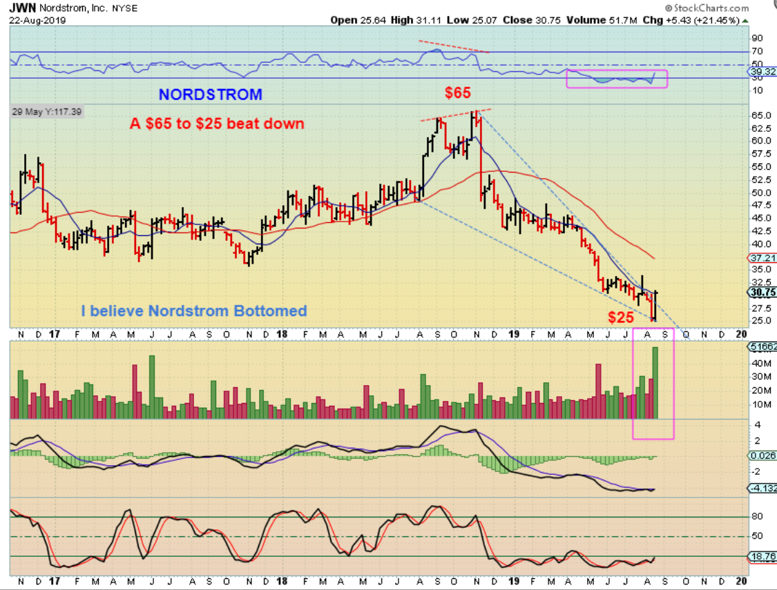 JWN – Beaten down from $65 to $25, it has reversed off of the lows this week and is up 21.5% ! I drew a falling wedge in Blue, so Nordstrom now looks bullish. If the Markets can remain bullish, this may start its recovery higher.