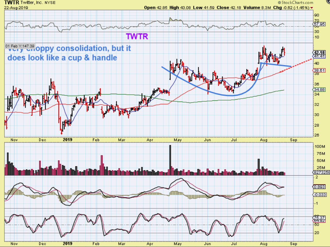 TWTR – This does look like a cup & handle, with a target of $47. So even though it is choppy and difficult to buy & hold, it is a longer term bullish set up. Success may depend on what happens to our General Markets too.