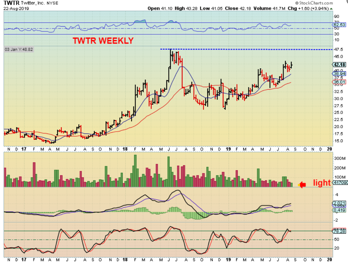 TWTR WEEKLY – When I look at the weekly, I would think that the Cup & Handle daily will help TWTR get to that $47.50 area and that also finishes forming this cup.