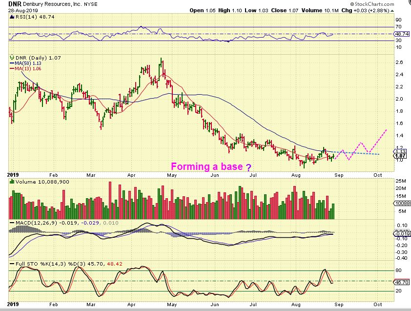 DNR – This may be basing instead of the V-Bottom that it used to put in. In the past, this was a FAST runner in prior rallies, rocketing higher out of a V-Bottom low, but so far I see it chopping sideways and maybe battling the 50sma. It is worth being on a watch list as it seems to be building a base.