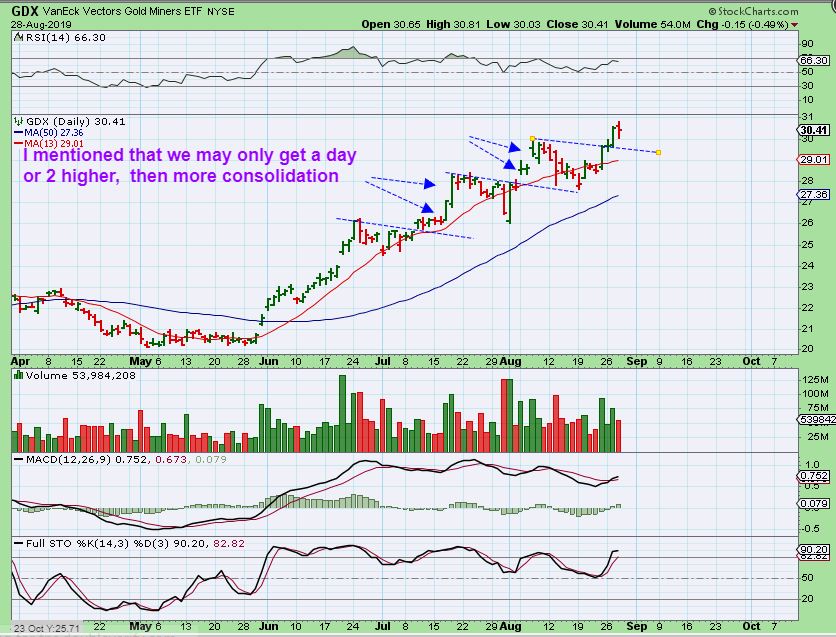 AS TIME GOES ON, THIS DIVERGENCE AT NEW HIGHS FOR GDX IS OFTEN A WARNING SIGN, but the bull are definitely in control! That said, We do have a decision coming up. Gold looks like a Bull Flag or Pan & handle and can go higher, however, The U.S. Markets have a holiday & are closed on Monday for Labor Day. Gold & Silver DO trade Sunday night, so with that GDX divergence, we need to decide if we want to hold a full load of Miners over a 3 day weekend? Will you sleep better holding smaller baskets? Do you have leverage? If so, do you wish to hold through the US Holiday – 3 day weekend, as Gold trades on higher or lower? Will you cut back to be safe, but possibly risk a little upside if Gold & Silver were to shoot higher Sunday- Tuesday morning? Those are a few of our choices. Those in Canada , Europe, and other countries will be able to be in front of their screens Monday and are less affected.