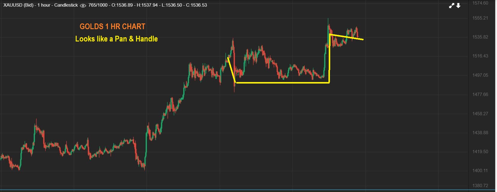 GOLD -The 1 hr chart seems to have formed a PAN & HANDLE. I consider this a bullish set up AS LONG AS THE HANDLE does not break lower than 50% of the Pan. (Roughly $1510-$1515). Gold is $1540 as I write Wednesday night. So on a daily chart…