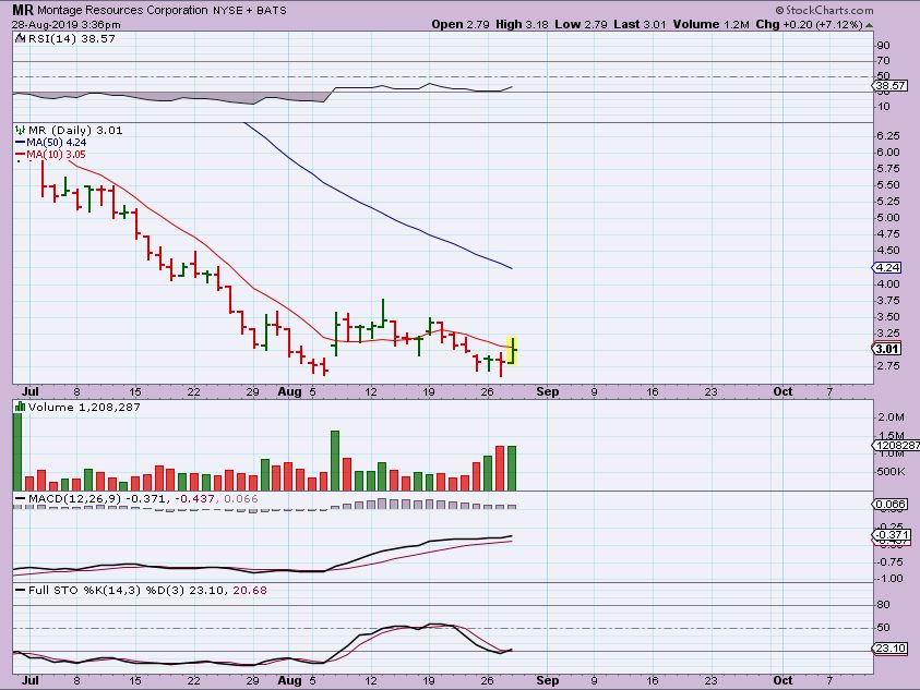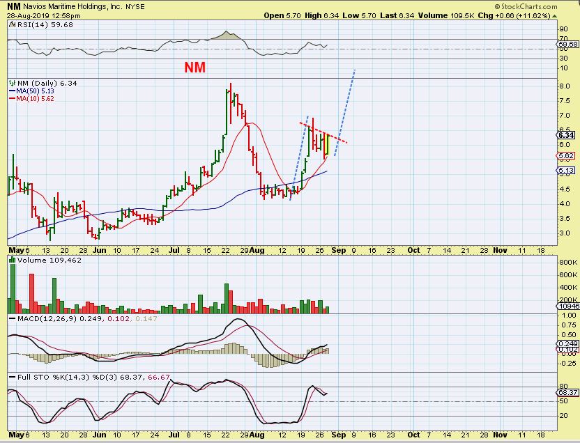 NM– A Shipper. In June- July NM ran from $2. 75 to $8! It then crashed down to $4, and ran from $4 to $7 is 1 week of August. These are Huge gains. So now it tagged the 10sma & flipped higher, so I bought it. I expect a run to $8 or $10.
