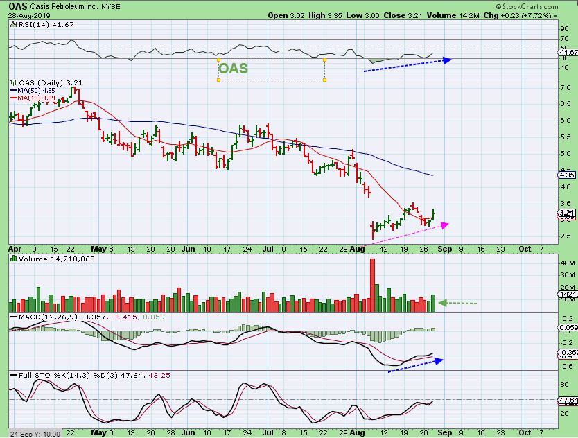 OAS– I used to trade this stock in the teens often, and it hit $2.50 with the recent sell off. Wow. Well, it put in a higher low and has moved back above the 10 & 13 sma and the MACD crossed up too. It looks to be working its way up to that 50sma.