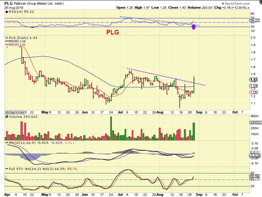 PLG – Also a Platinum Miner, PLG certainly responded to the Platinum Pop. I didn’t buy it, but this looks ready to make a nice run. If it bull flags , I will buy it. So far this is a short term double bottom base.
