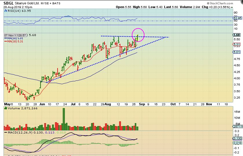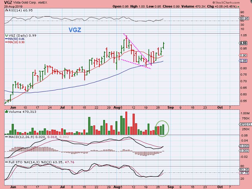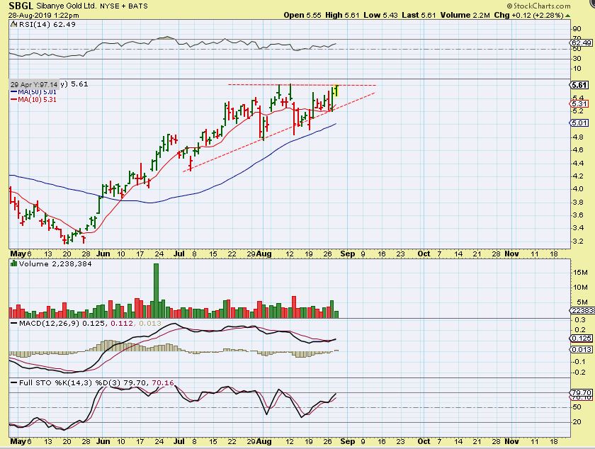 VGZ– You can see that VGZ is starting to run higher now, back toward the recent highs. I added to my position. AUY & SBGL are already at new recent highs, and so on.