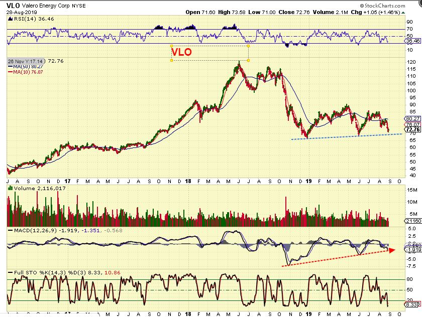 VLO – VLO ran from about $35 to $120 in 2016 to 2018, but has been beaten down. It may be approaching support at $70, it could break down and fall to $40! So buying near support maybe just a bit lower, a stop can be placed under that area. The MACD is rising nicely.