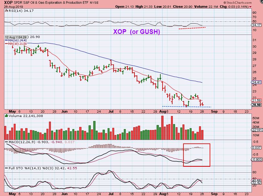 XOP Aug 26– I showed divergence starting to develop on XOP 3 days ago as it bounced along a bottom.
