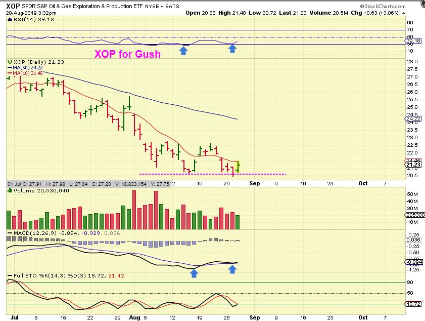 So here is a choice that traders do have. I tried to buy GUSH & got stopped out with a tight stop last week, but now it set up again (Matches XOP), so even though I am not 100% confident that OIL & Energy are ready to go higher right away, there are signs of bullishness & possible bottoming action. At these lows, it is a Low Risk Entry with a tightish stop. I will discuss that a bit more at the end of the report too.