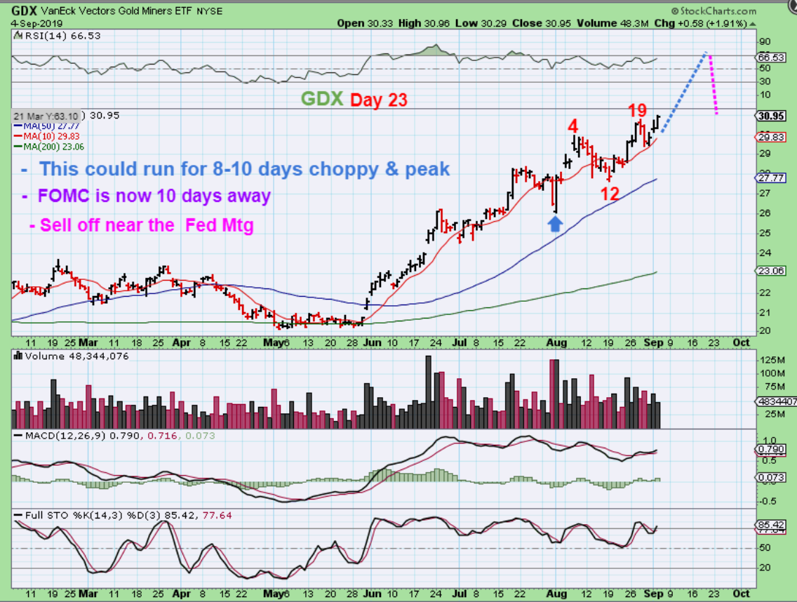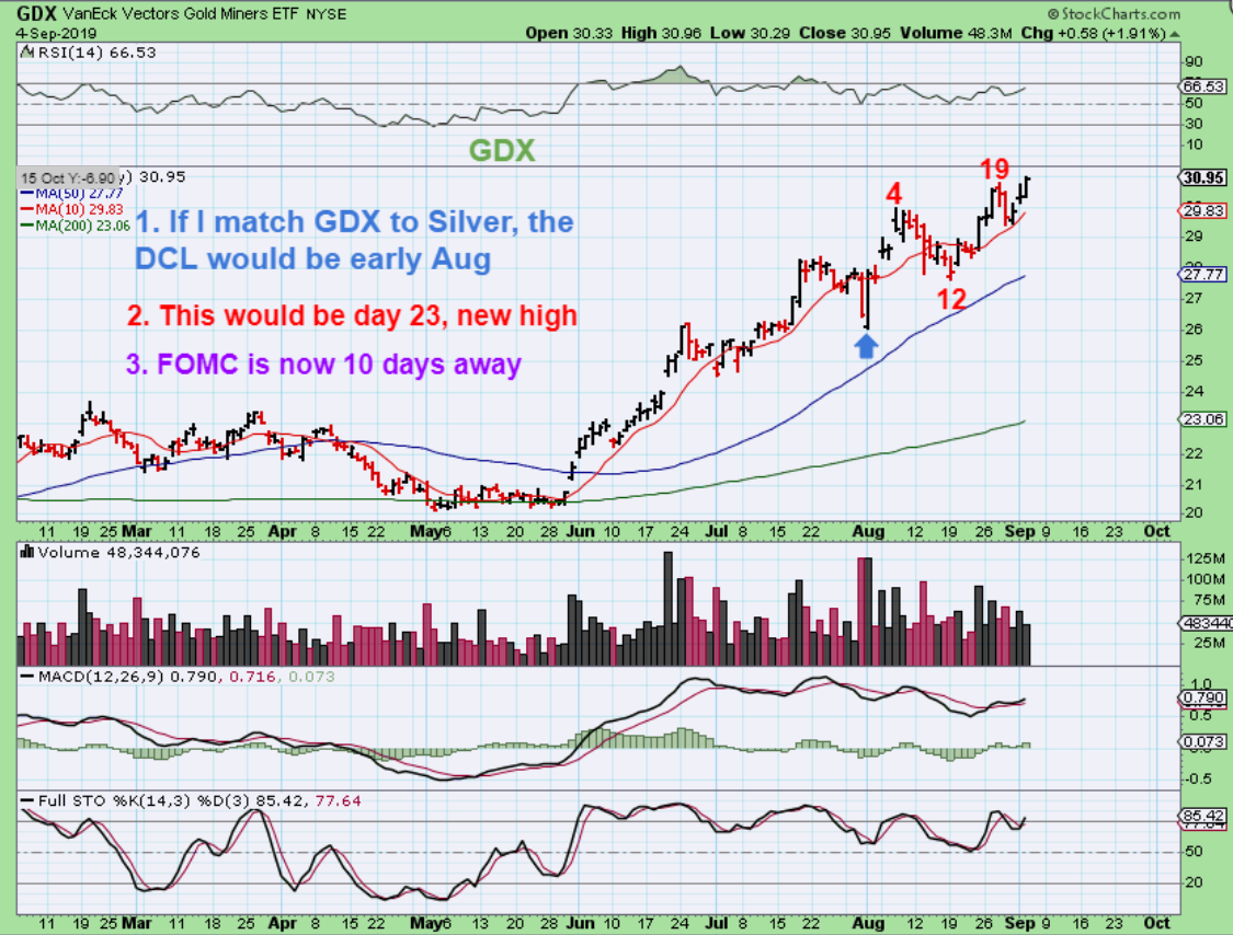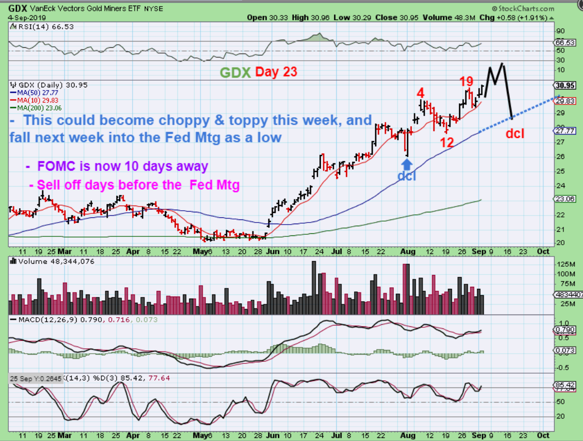 GDX #1 – If we match GDX with Silvers cycle count, it would look like this. This would be a new high on day 23, and we know that they can last anywhere into the 30’s.  NOTE: With the FED MTG  10 trading days away, I can imagine 2 different possibilities ahead