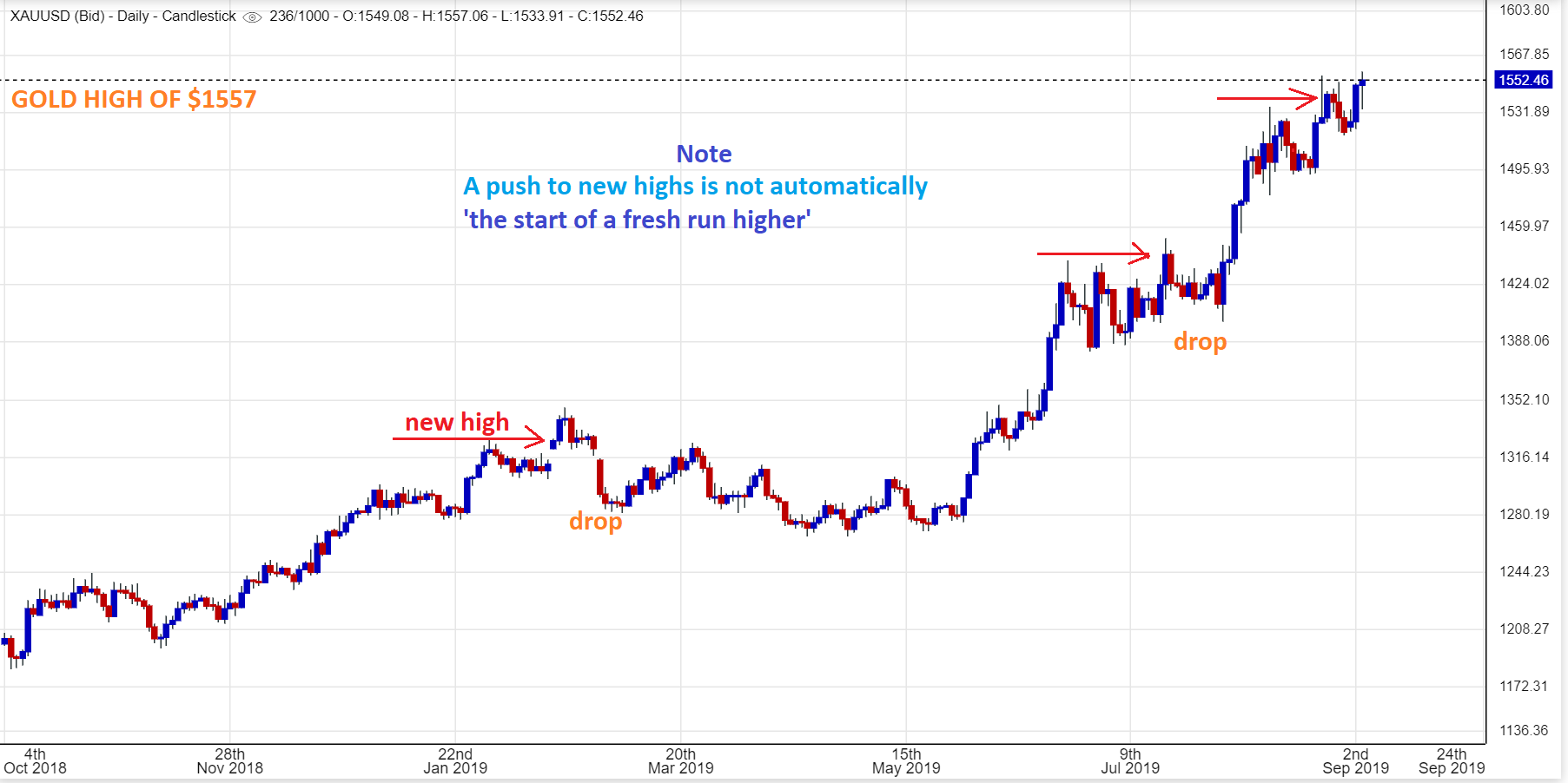 GOLD #1  – So Gold & Silver pushed a bit higher  to new highs on Wednesday. I know that that is exciting, and this COULD keep climbing, but I am just pointing out here that a push to new highs does not automatically mean that it will just keep going.  In the past, we’ve seen New Highs Pop & Drops. See the chart…