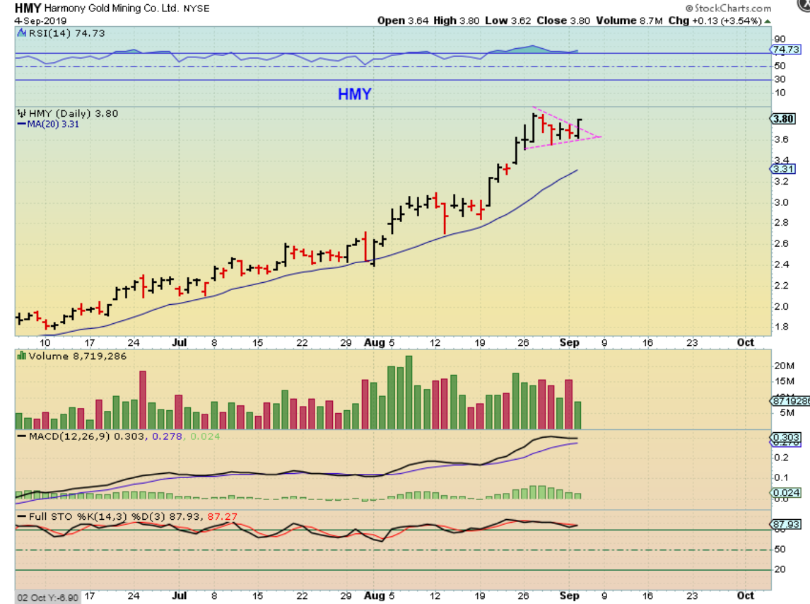 HMY  – HMY has hardly pulled back and actually looks ready to break to new highs again, if Gold continues higher or goes sideways. This has been a great ride, easy to buy and hold. Many of us got this in May and have enjoyed this run.