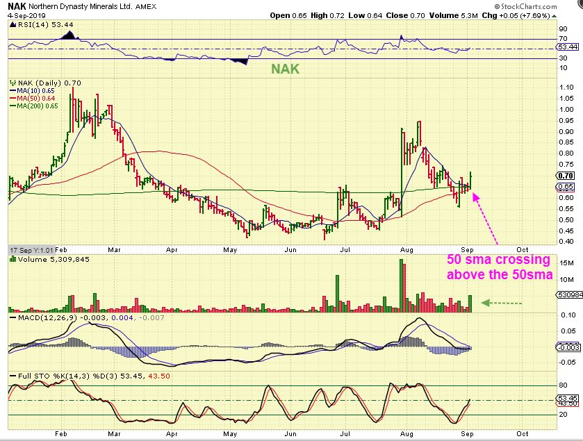 NAK WEEKLY  –  The weekly chart looks like a large base and price also held at the 50 week ma. Even a run to the 200ma would be a nice gain, but if it breaks out, it could make a great run over time.