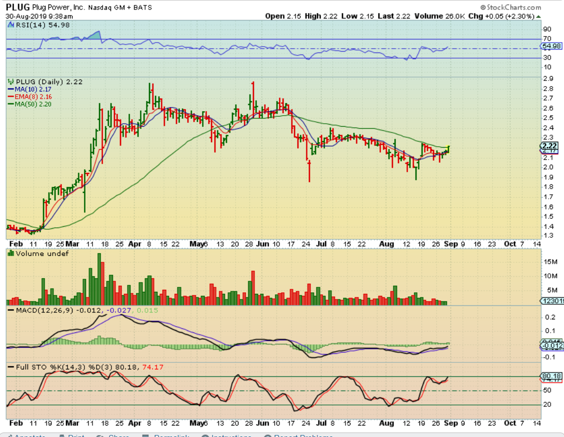 PLUG  – PLUG did a shake out at the 200 sma in Mid August and recovered. Now it is pinched between the 200 & the 50. That can be explosive if it breaks higher, so I am waiting a bit longer. If it breaks down, I’m out, if it breaks higher, I might even add.