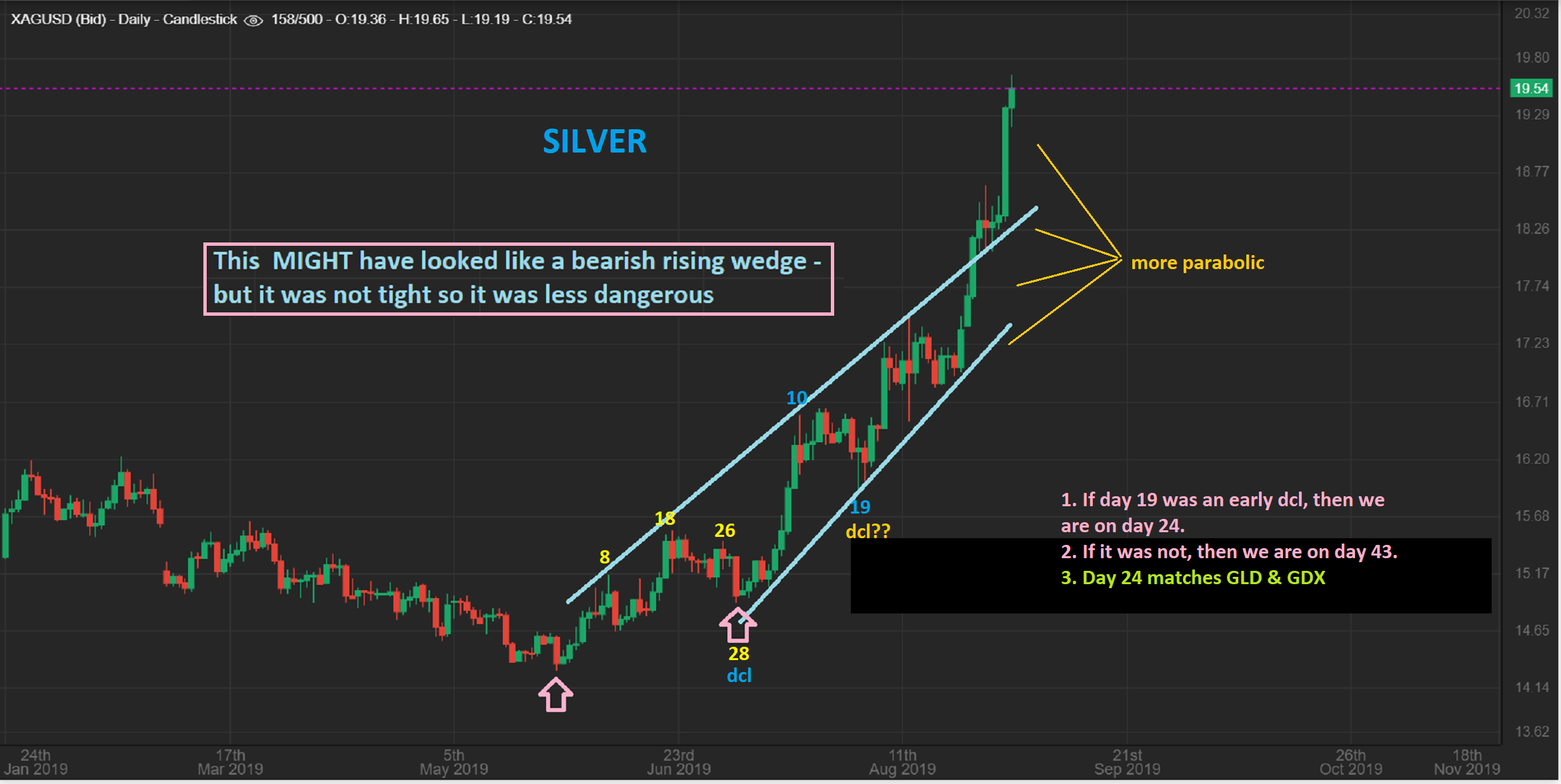 SILVER  – Silver has just exploded higher. The cycle count seems to be clear here, with Silver at day 24. That makes this move a short term parabolic burst and likely it will not be able to continue for much longer. Silver hit $19.65.