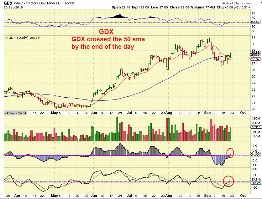 GOLD – You can see that Gold & Silver sold off early Friday and then sold off again after 12 p.m. Eastern Time, but then they suddenly started to climb into the end of the day. Since Gold shot up $18 above that $1508, that is a break of the 10 sma mentioned above, and Miners did follow…