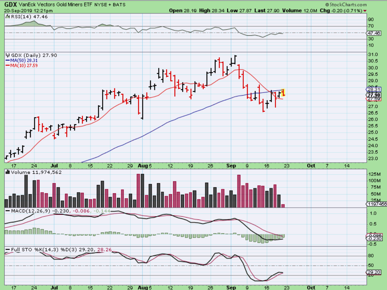 GDX DAILY FRIDAY MIDDAY– I grabbed this chart on Friday to show that GDX was being rejected at that 50sma midday. After a Fed day reversal, we had no follow through due to that 50 sma…