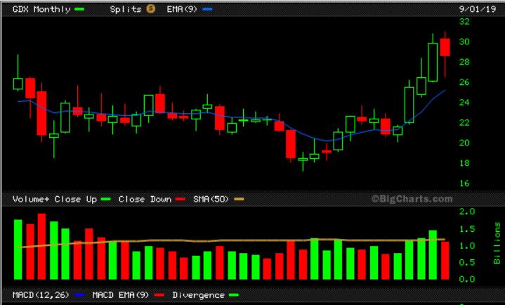 GDX MONTHLY – You can see that even if GDX rises this week, the Month ends next Monday and we could have a topping Candle forming. I will just keep in mind that a run in Miners is possible, but could be shorter lived than one would hope for. Under these conditions, I personally just Use Stops, Raise Stops over time, and Stay Frosty! You may still be able to lock in solid additional gains.