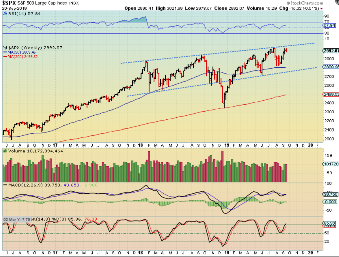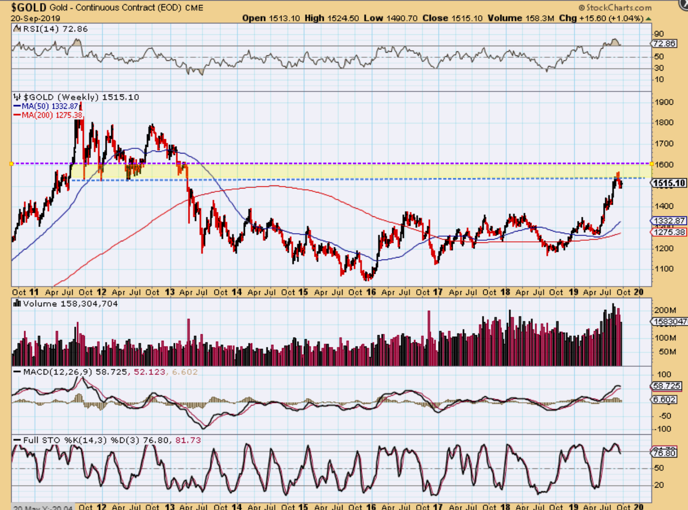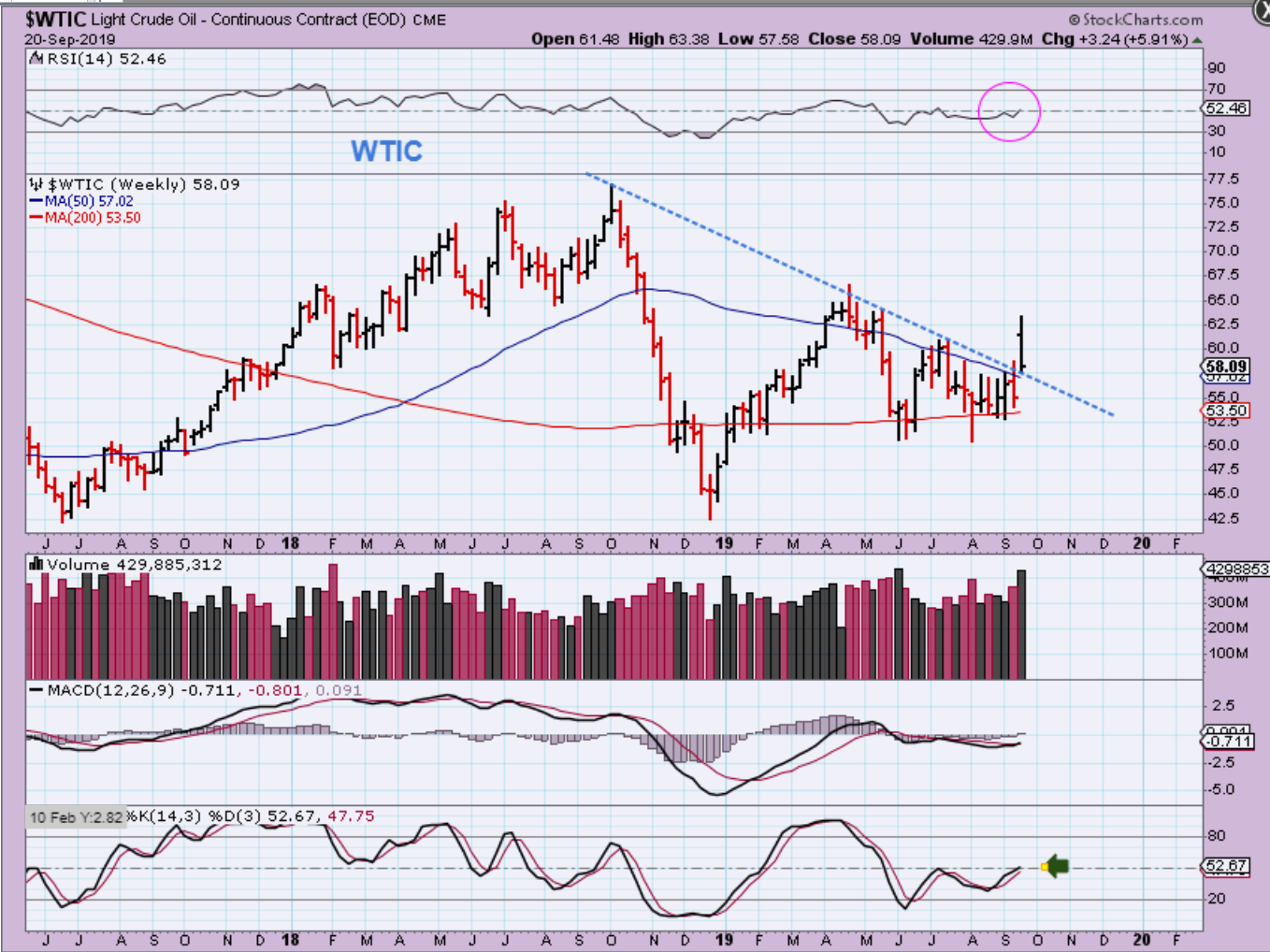 WTIC WEEKLY – With a drone strike seriously damaging a Saudi Oil Refinery, Oil broke out this week and then reversed right back down to the prior resistance. It is not overbought on a weekly basis so it can find support in this area, but it does need watching just in case it breaks back under support.