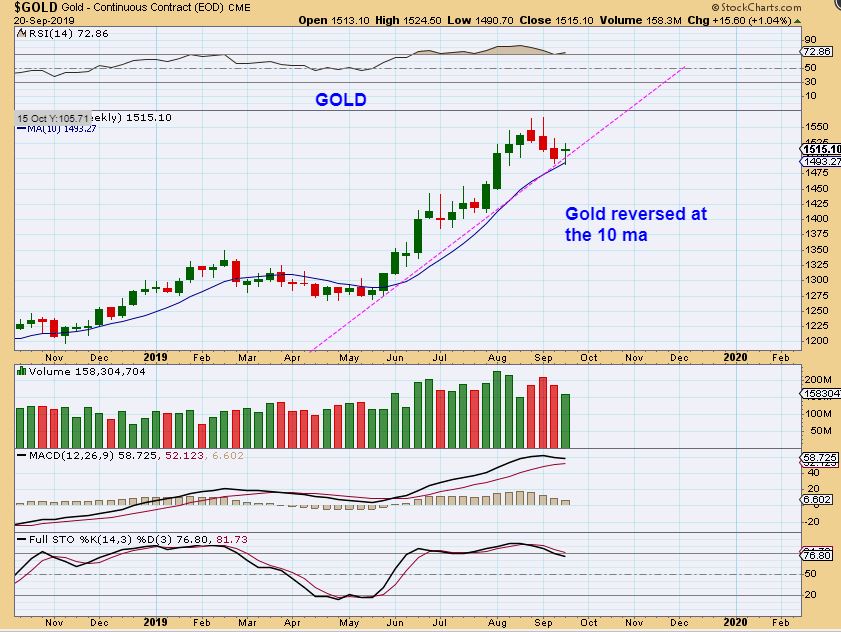 GOLD WEEKLY – On a Gold Weekly Chart we see a bullish reversal at the 10 ma. In technical analysis after a bullish trend higher, that is a Buy with a stop under the lows. Raise the stop as price moves higher, because cycles call for caution when we are 4.5 months ahead of the last ICL in May.