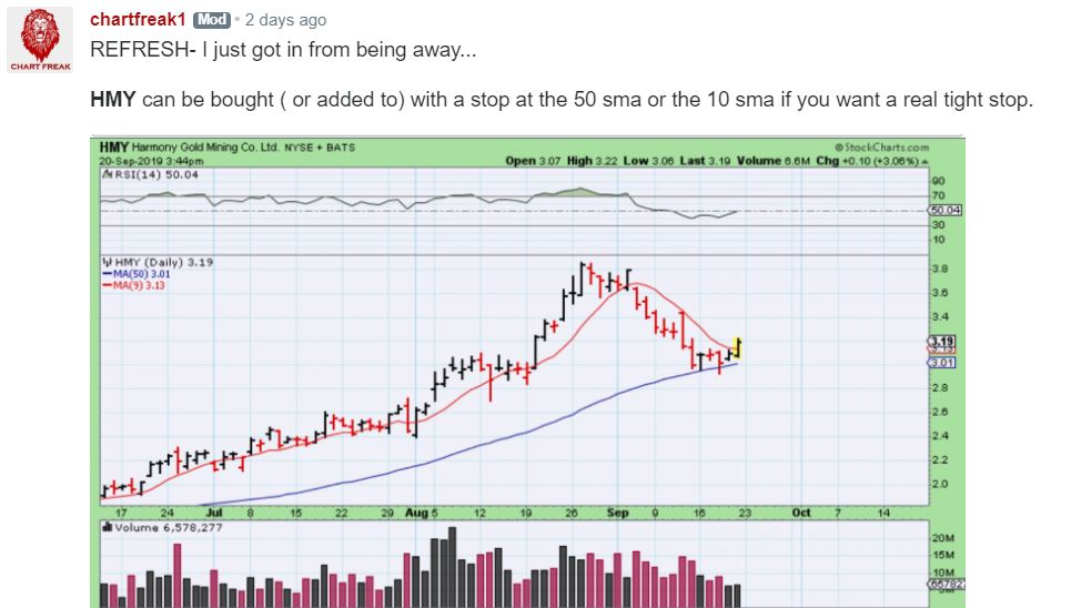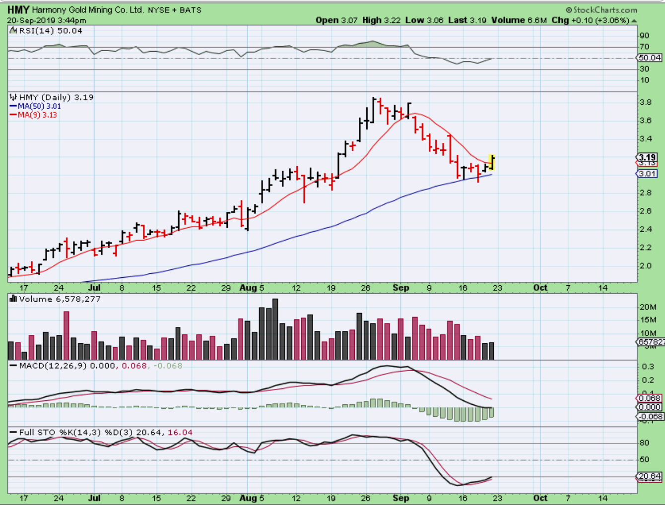 HMY – I have been saying that I bought HMY at the 50sma because it is acting Bullish during the pull back. Like DRD, it reversed at the 50sma. I posted this chart in the live trading area Friday as a break above the 10sma showed follow through & I added.