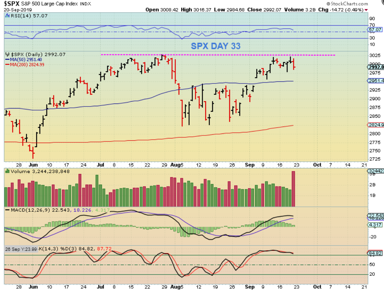 SPX – A drop for the general Markets Friday was not exactly unexpected. We are on day 33 of this daily cycle and should expect a drop into a dcl around this time.