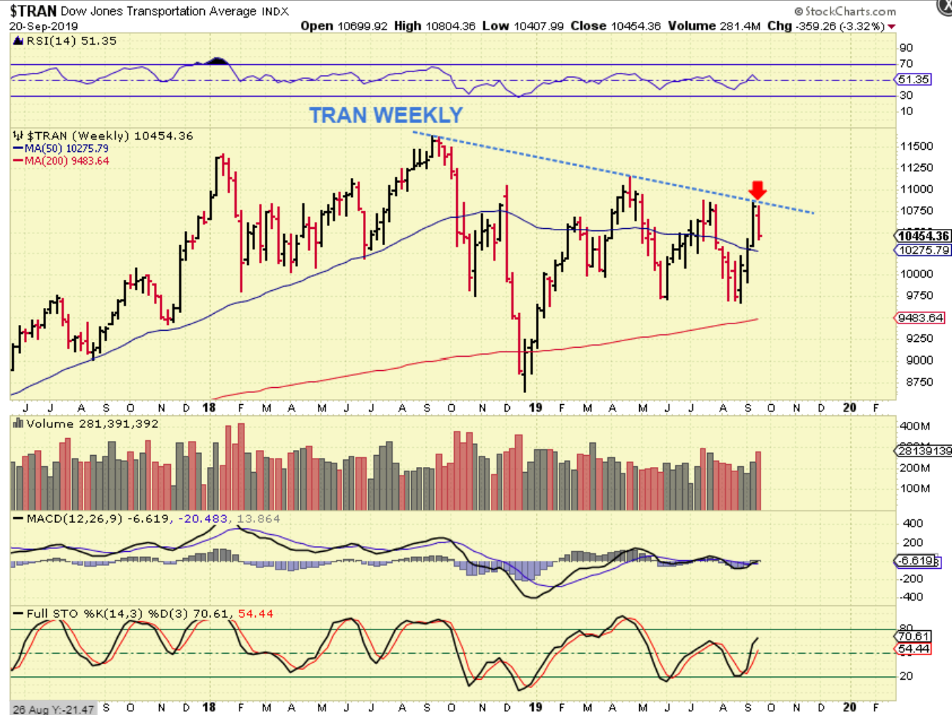 TRAN WEEKLY – The Transports drop as they hit resistance and we do have lower highs and lower lows in place, so the transports are not leading the markets higher.
