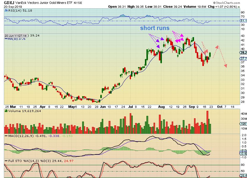 GDXJ AS A REMINDER: GDXJ & GDX reversals look great, but often move higher for short periods of time late in the intermediate cycle. Individual Miners like EGO, DRD, HMY, RGLD, AU, etc ran stronger as leaders, that may help your basket of Miners or trades, but the ETFs can get choppy.