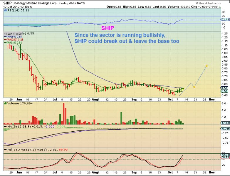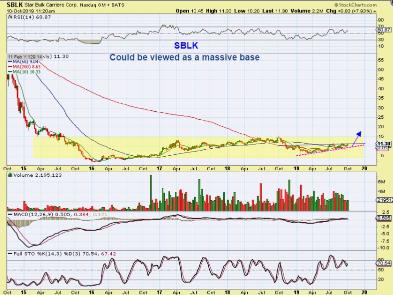 SBLK WEEKLY – Now trading at $11.20, SBLK has been slowly climbing since April of this year, when it was a $6 stock. This could be a long term base. It has almost doubled this year. It is above the 50 & 200 week ma.