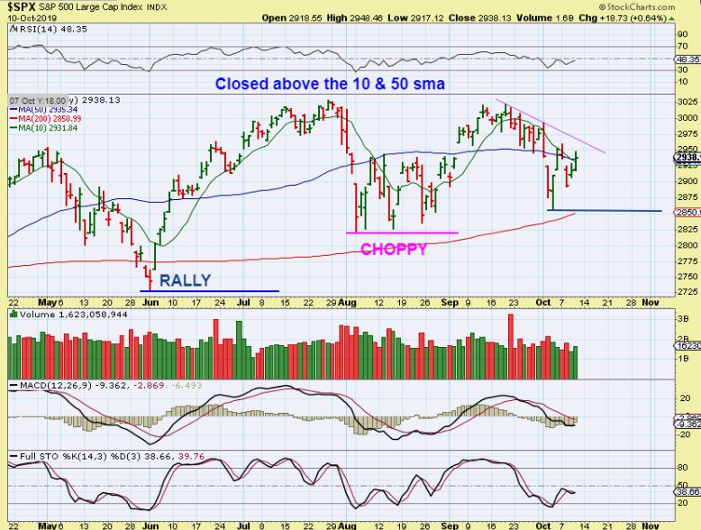 SPX – The SPX and NASDAQ rallied and then sold off into the close. Buyers are having a hard time taking full control, but they did closed above the 10 & 50 sma. This is day 5 and I would say that stops can be raised to the recent day 3 low and we’ll watch for a break of the overhead trend line. Hopefully this wont be as choppy as the last DCL.