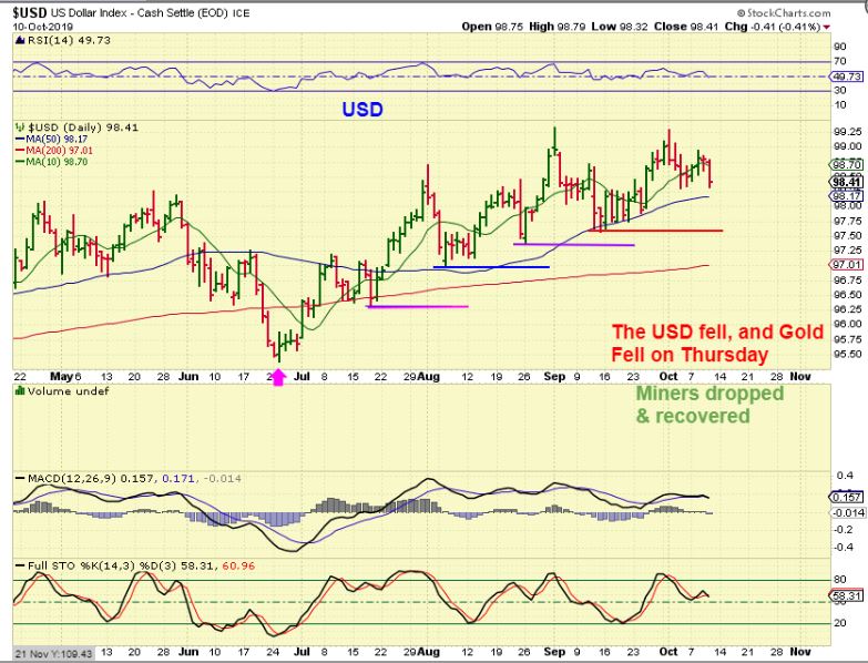 USD – The USD dropped Thursday, but that did not help Gold. Gold dropped and Miners dropped to their 10sma and then reversed higher. Precious Metals remain mixed…