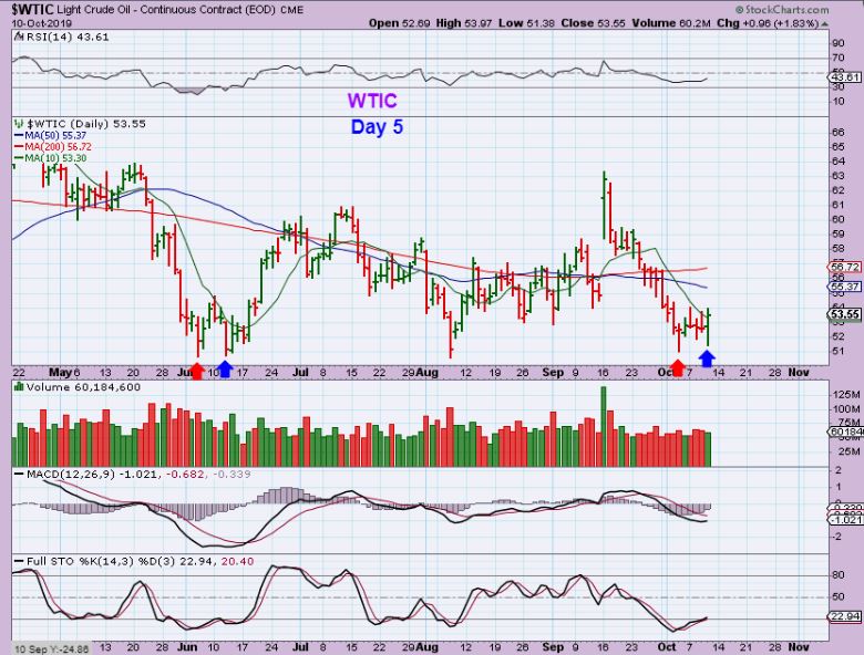 WTIC – Oil finally broke higher with a little conviction and barely closed above the 10 sma, so this should be day 5. The XOP & OIH sat at the lows, XLE moved up to the 10sma. Energy stocks still looked weak and look to be forming bases.