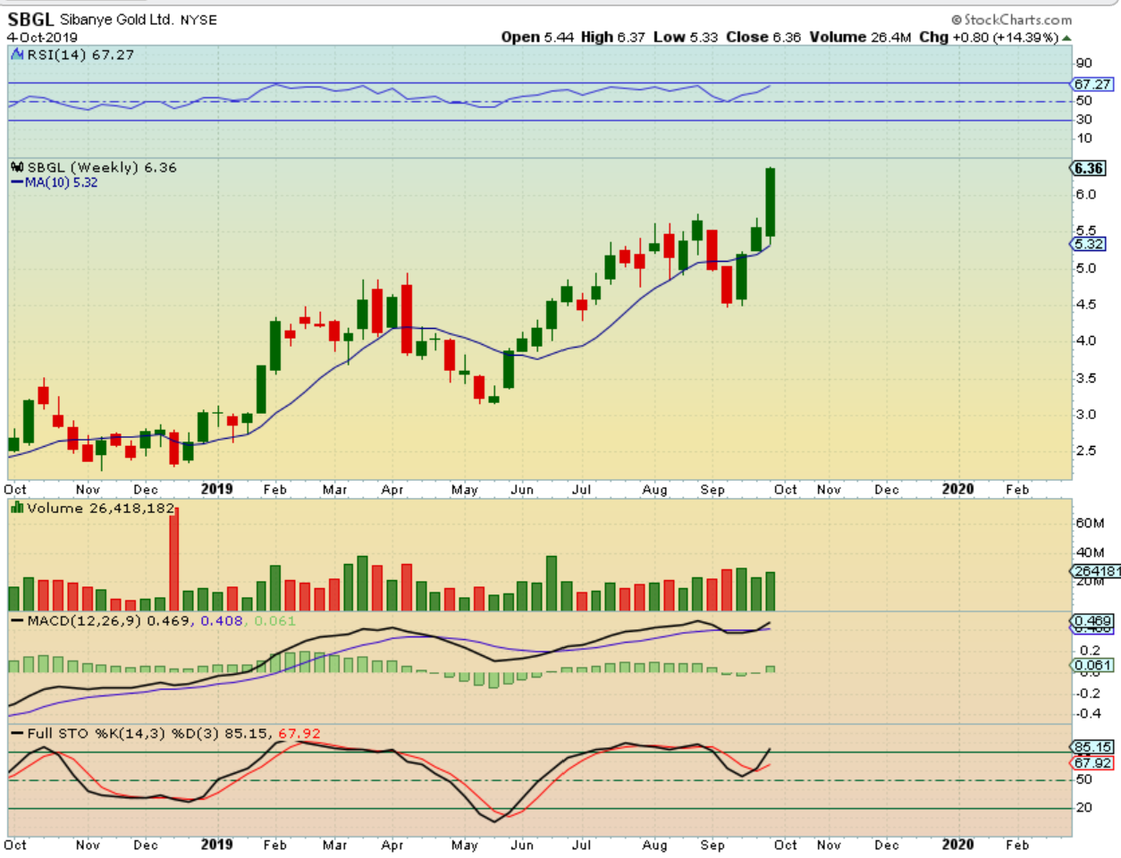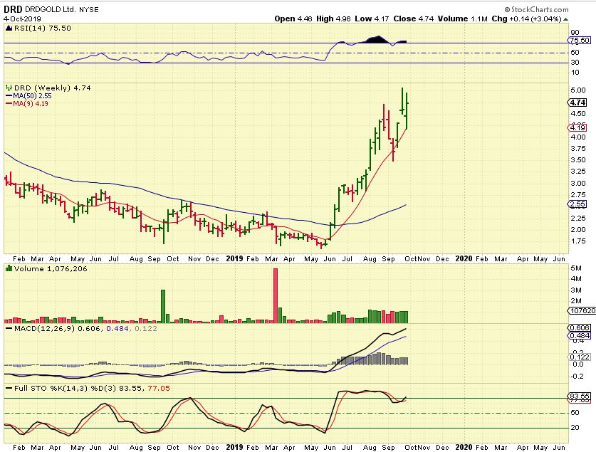 DRD WEEKLY – DRD never broke below the 10 weekly MA. I owned SBGL & DRD , but sold them mid week. I am wondering if I should have held longer, because this late in the intermediate cycle- these are Bullish stocks.