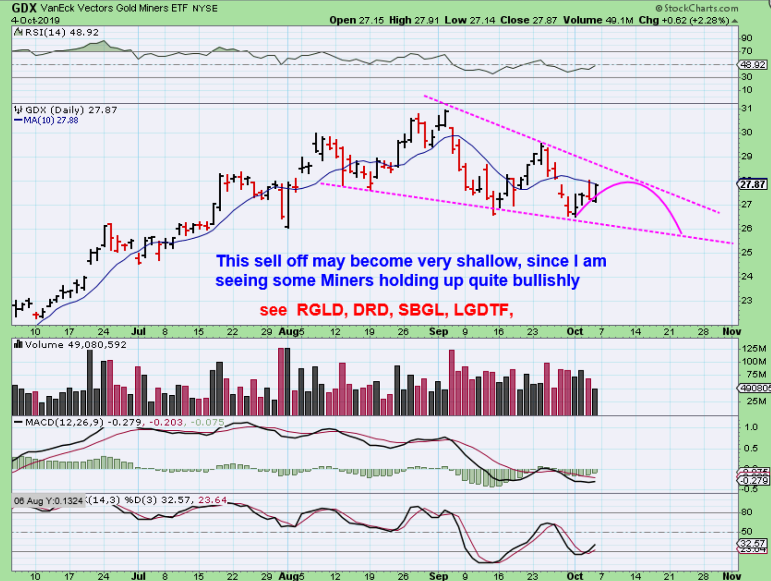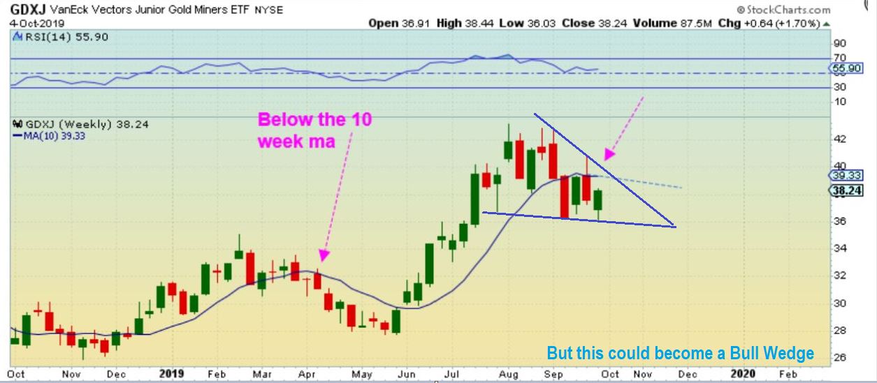 GDXJ WEEKLY – What about a possible Flag or triangle? That looks bullish as a possible Bullish descending wedge, right? …