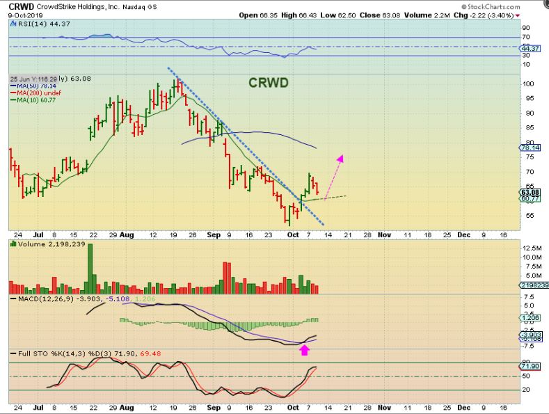 Now I would Watch CRWD for a reversal, since it may be setting up to put in a higher low. The green line is the 10 sma.