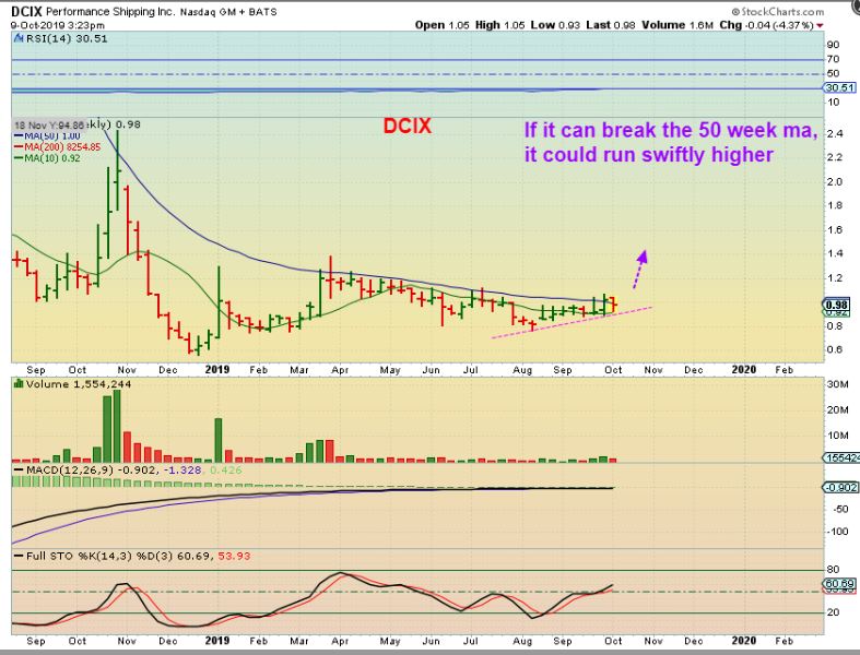 DCIX – So I was looking at DCIX and noticed a LONG base forming under the 50 week ma. This could continue sideways for weeks since it already has, but with so many Shippers taking off higher, I’m thinking that this could break out too. I bought it at $1.00, and a break & close above the 50 week MA should be considered Bullish.