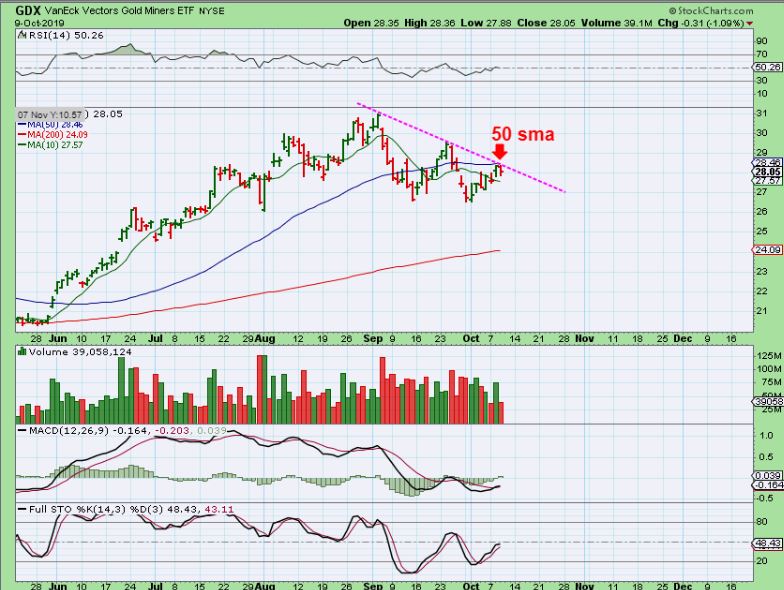 GDX – GDX was held back by the 50 sma & that down trend line, so we have little change here too. A break down from here would start a drop into a Daily Cycle Low, and a break out & close above that 50sma would be viewed Bullishly.