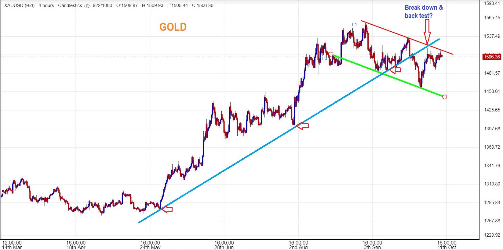 GOLD #2 – So this 4 hr chart shows our trend line overhead. If Gold breaks out & runs, it will be considered bullish, but if it starts dropping, it is likely heading down into the dcl / ICL.