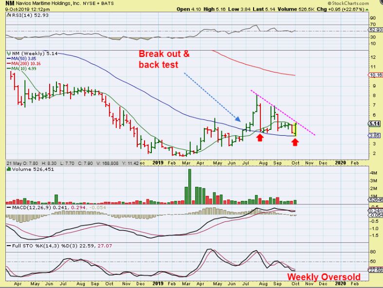 NM WEEKLY – On a larger weekly chart, NM rallied strongly in June & July, and has been back testing & forming a large wedge. It is up 23% for the week, yet remains oversold weekly. It could break out & run further, so if you bought it, you may want to hold on a bit longer.