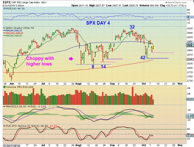 SPX Same chart – I just want to point out that after the August dcl, we went sideways for over a month. Look at day 8 & day 14. We saw choppiness and slightly higher lows out of the last dcl, so this could play out in a similar manner, but hopefully it just moves higher & confirms the dcl soon.