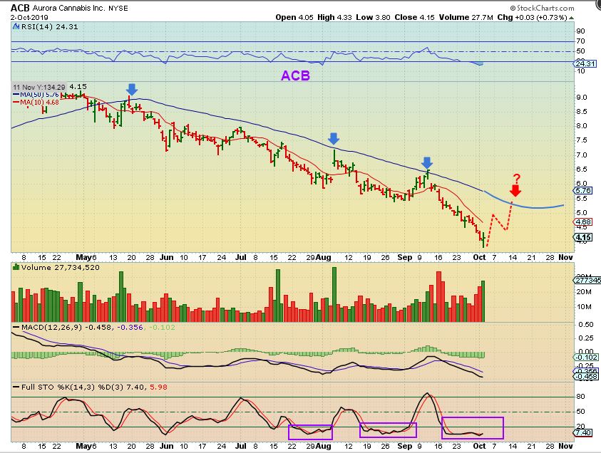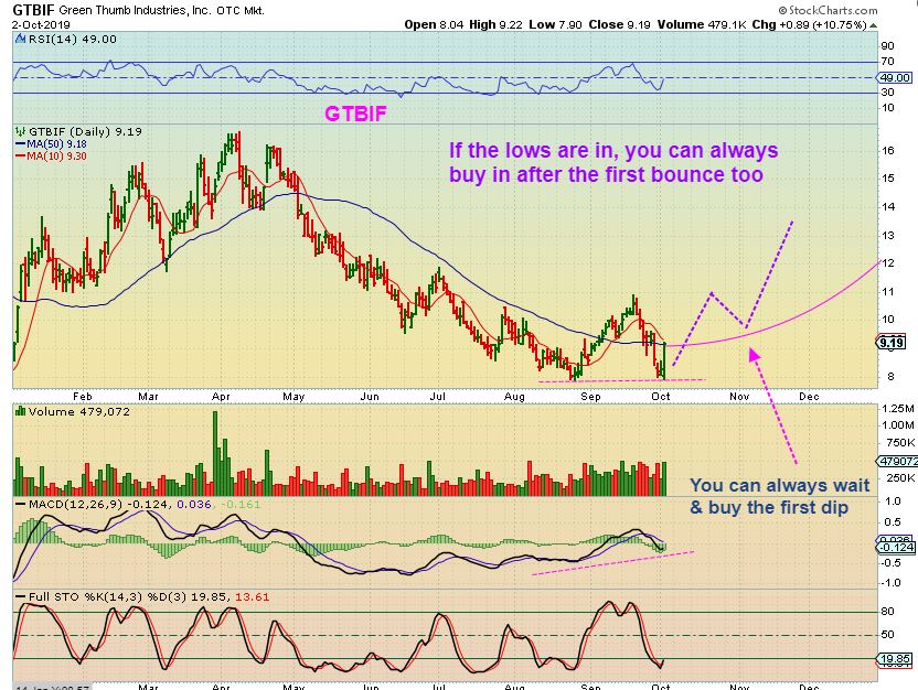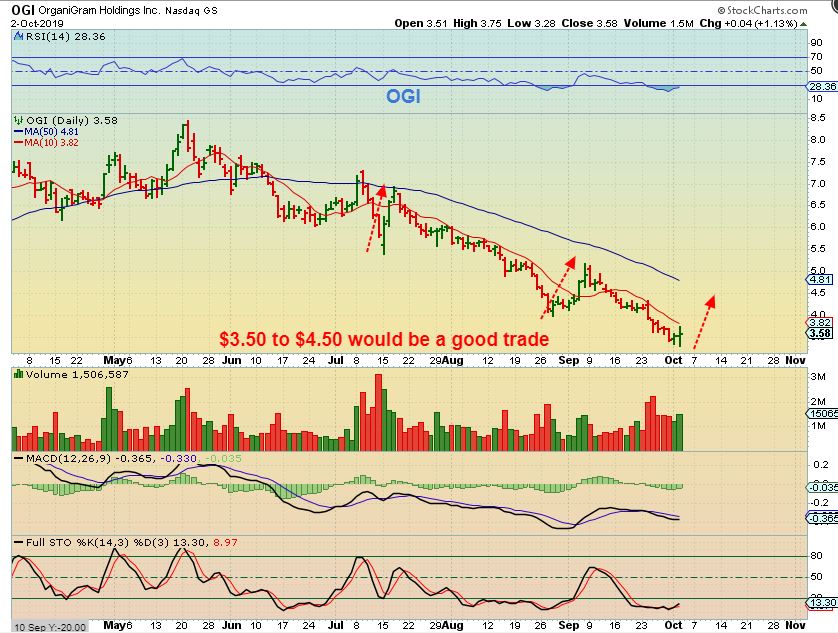 When discussing OGI or ACB and I say that $4 to $5+ is a good trade*, picture it this way… You have a stop below the reversal to protect funds. If you buy 1000 shares of a $4 stock like OGI or ACB and it goes up $1 – you gain $1000. Close the trade & walk away. If you buy 2000 shares and it rises $1, and you sell? You pocket $2000. What if you buy 3000, or 5000 shares? You get the point. Those stocks could easily gain $1 if the lows are in.