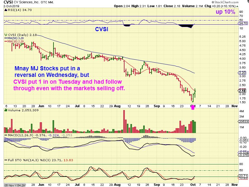 CVSI – $1.50 to $2.30 in 2 days (low to high). Remember, even with the Markets selling off, the MJs reversed and CVSI had follow through higher, so this MIGHT be a sector to watch or even participate in. IN FACT…