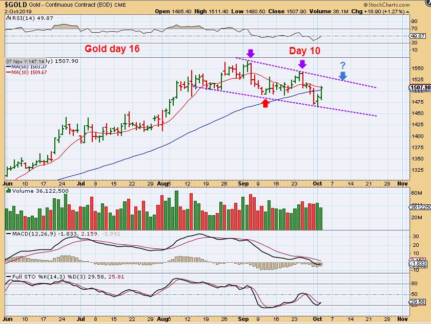 GOLD – Gold has a swing low, but this is day 16 and it seems early for a daily cycle low and also it did not close over the 10 sma . Not only that, The Miners did not seem to believe Golds 2 day push higher…
