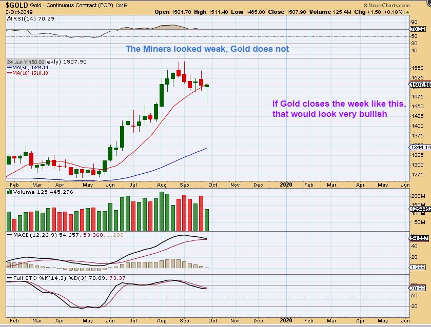 GOLD WEEKLY – I have to say- This is confusing. If Gold rises further into the weeks close, this weekly chart looks like a very bullish reversal, but Miners look weak. So I am watching the next few days closely.