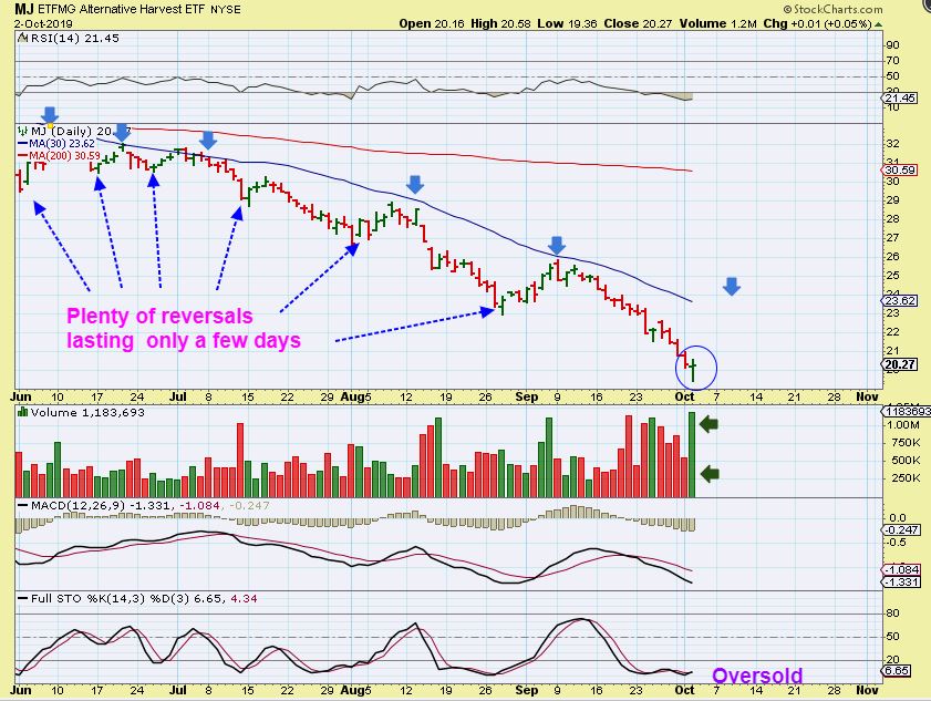 The MJ Sector and MJ Stocks are now pretty much hated. Actually, I’d say it is a combination of hated and feared after this long term sell off. Those that have tried to buy these dips have been stopped out repeatedly, but ONE of these reversals is going to be THE LOW. A bounce can be traded short term or even with a buy & hold approach to see if this is the low that will last for more than a few days, so I will discuss that…