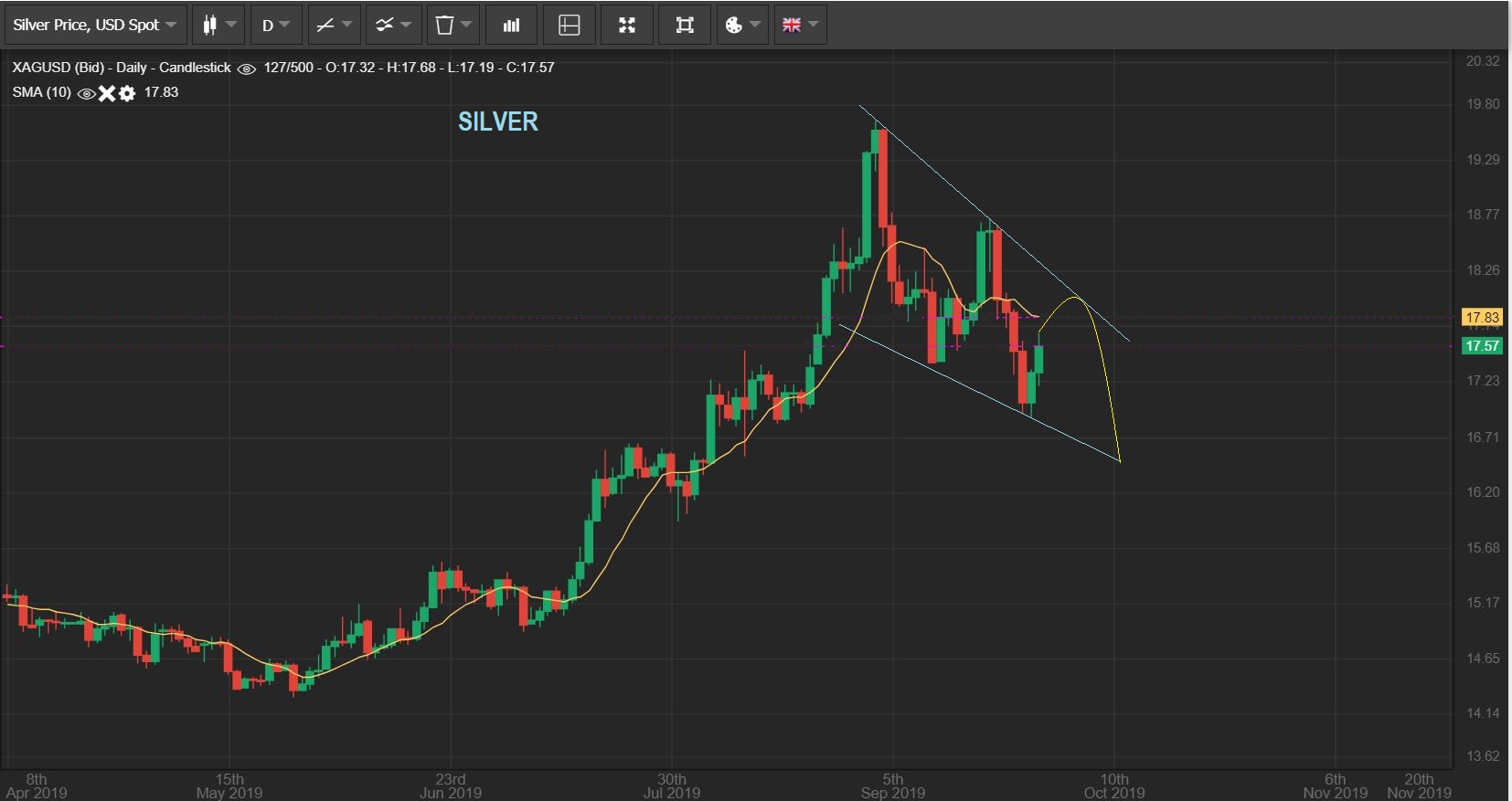 GDX – We are getting a little bounce. I drew this at Midday, just to show that Miners do not look as good as Gold or Silver. I’d expect it to possibly back test the 50 sma or 10 sma and eventually begin to finish this drop.