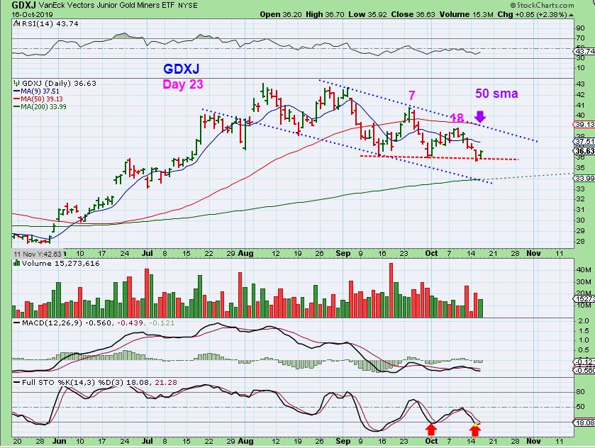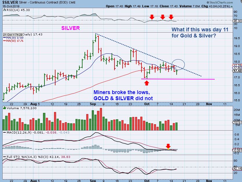 SILVER – Silver does not have much overhead room before it will regain the 50 sma & downtrend. I will be watching this, because what if this was day 11 & broke higher? Gold & Silver did not break the Oct 1 lows, Miners did make new lows, so it would get tricky…
