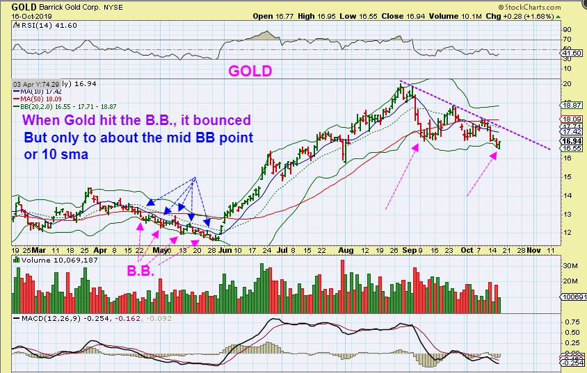 BARRICK GOLD – Many Miners are tagging their Bollinger Bands & bouncing, but that is normal too. Look at the sell off in March to the may ICL. There were many reversals and bounces, but the trend was still down.