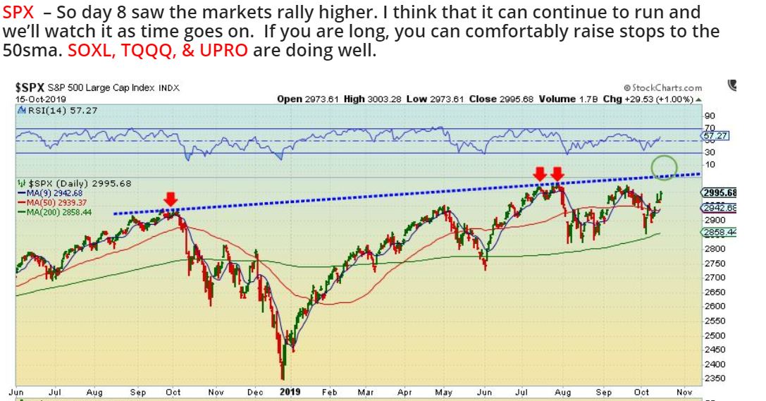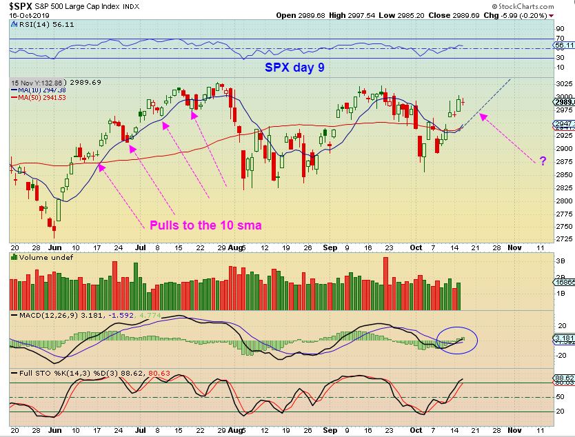SPX – The markets paused on day 9, but this can still run higher. Notice how the June / July run paused & tagged the 10sma. Normal market action so far, but that first run was strong…